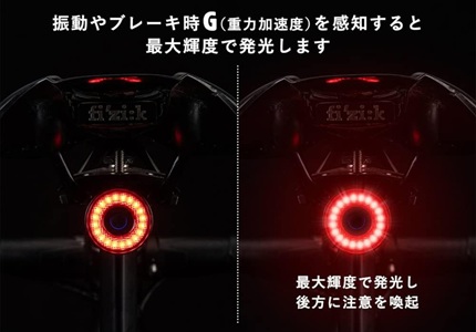こちらは、自転車のサドル後ろにつけるテールランプですが、普通のテールランプとは違って、速度の上げ下げを感知して光の強度を変えてくれます。